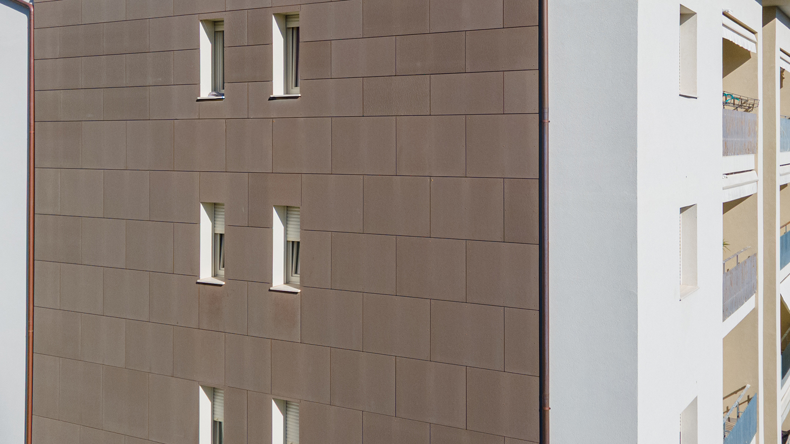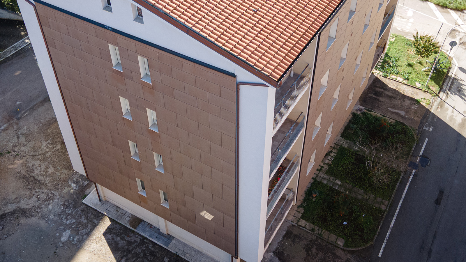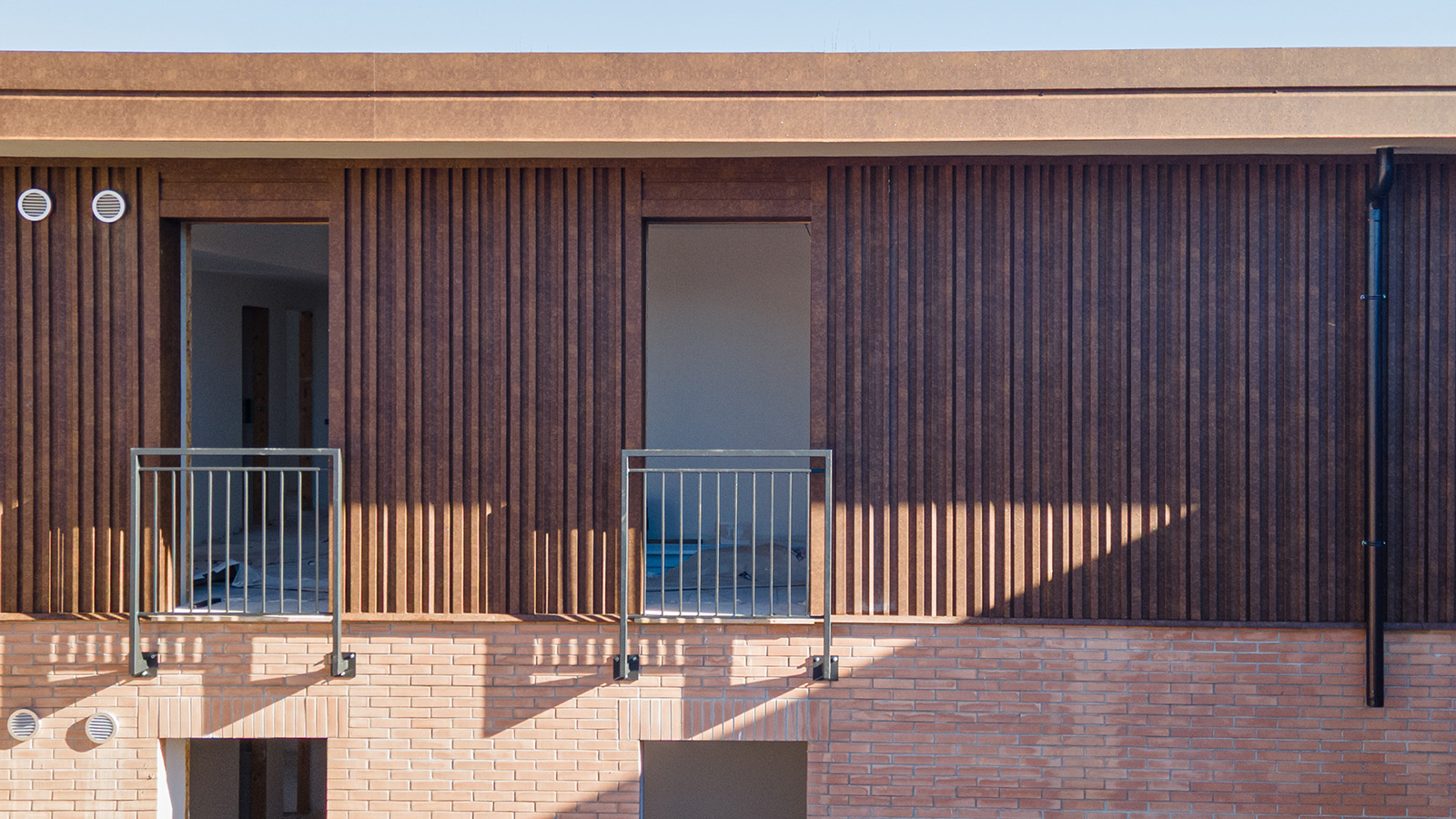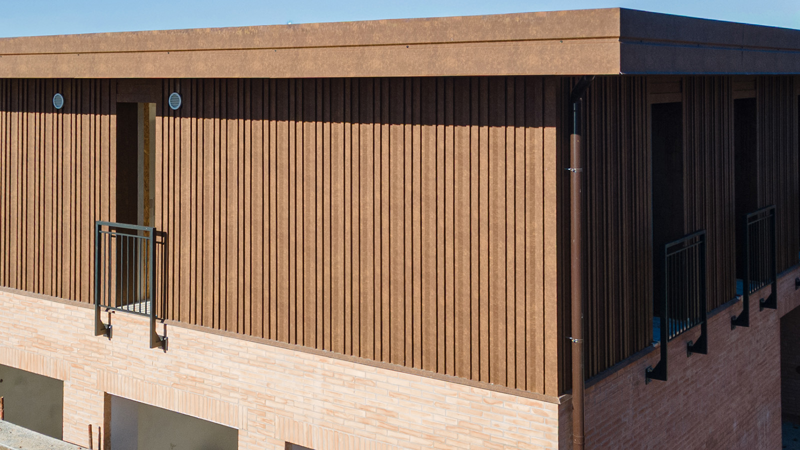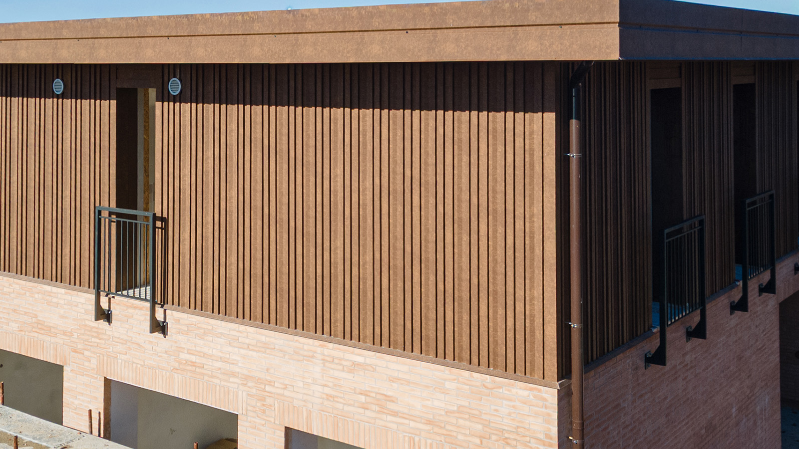 Progettazione e sviluppo imbotti per finestre, rivestimento terrazzi a doghe in lamiera con fissaggio nascosto e rivestimento in alluminio 15/10 finto corten per torri con doghe verticali.